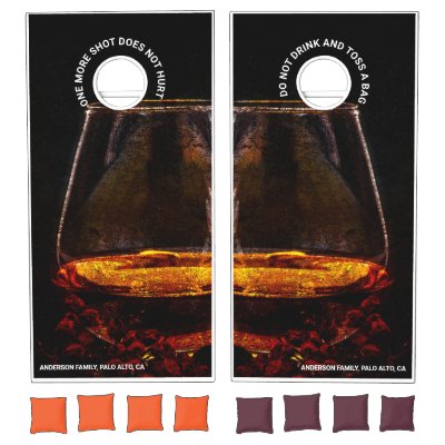 A glass of warming drink. It may be whiskey brandy cognac or some kind of soft drink who knows. A two round-shaped customizable template texts around a hole: "One more shot does not hurt" and "Do not drink and toss a bag". A template family name city state at the bottom of each board. You can change or delete three template texts independently to create a custom design. Funny elegant cheering cornhole board set for you to entertain your guests. This cornhole game can be found in the "Festival Of Gifts" collection or in the "Sports Toys & Games" department. myEverything