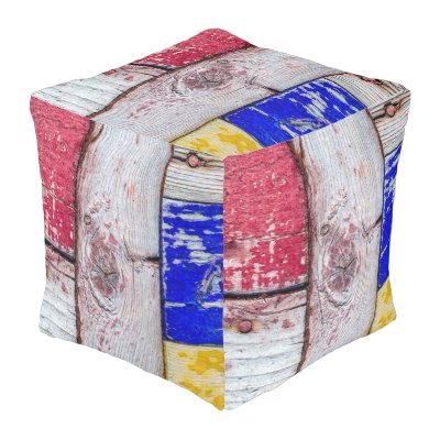 This is a cubed pouf. A grunge wooden texture with knots snags nail heads and peeled off old paint. In the days of yore some parts of this surface were painted in red blue and yellow. Have fun and be happy! myEverything