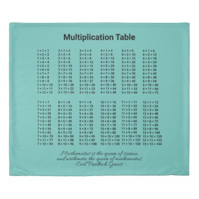 The multiplication table and Carl Friedrich Gauss quote: "Mathematics is the queen of science and arithmetic the queen of mathematics". Science and education design for students teachers and math lovers. Nice duvet cover for your bedroom. Customizable. You can change the image. You can transfer this design to a variety of other products of your choice. Please use the "Edit Design" button to adjust the picture to the shape of the particular product. It will transfer you to the Designer Tool. Use the "Fit/Fill" option (right-side menu of the Designer Tool). You can scale rotate flip the image on the product template and you can add some text of your own to it. You can also change the color of the background. Just be creative buy one have fun and be happy! myEverything