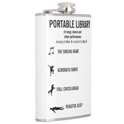 The text Portable library of songs dances and other performances complete & unabridged. The image of musical notes and a text the Singing Heart under the text. A silhouette image of a dancing man and a text Acrobatic Dance under the singing heart. An image of a horse standing on its rear legs and a text Full Circus Ahead. A silhouette image of a lying man and a text Peaceful Sleep in the bottom of a funny one-of-a-kind hip flask for men. Customizable. You can change or delete everything. Use the Customize button to fine-tune the product. Have fun and make one. myEverything
