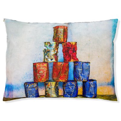 Pyramid of empty soup cans. Some cans are painted others are shot through. Apparently they served as training targets. Another interpretation of the famous pop-art theme. Pet's bed. myEverything