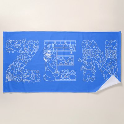 Zen text image made with the artistic font created by Valeria Guadalupe Caballero - talented young designer from Argentina. White text blue background. Positive design. Very good as a gift. One of a kind beach towel for him. Customizable. You can change the image. myEverything