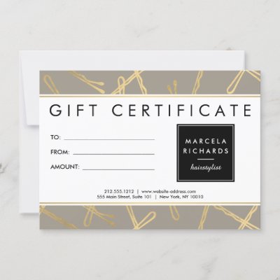 Coordinates with the Chic Gold Bobby Pins Hair Stylist Salon Gray Business Card Template by 1201AM. A fun and eye-catching design of falling faux gold bobby pins create an intriguing background on this customizable gift certificate template for hairstylists hair salons beauty consultants and more. Art and design © 1201AM CREATIVE myEverything
