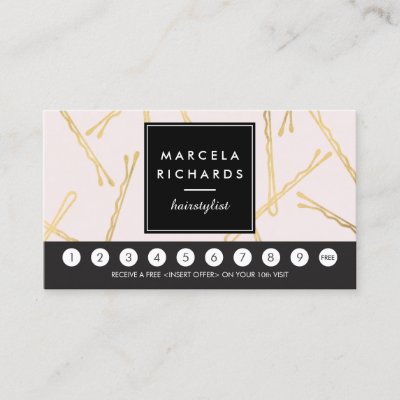 Coordinates with the Chic Gold Bobby Pins Hair Stylist Salon Pink Business Card Template by 1201AM. A fun and eye-catching design of falling faux gold bobby pins create an intriguing background on this stylish loyalty punch card for hairstylists hair salons beauty consultants and more. Update the promotion text for your desired offering. Generate more sales and visits by encouraging your customers to return for a discounted service or free product. Use a hole-punch or small stickers to validate each visit. Art and design © 1201AM CREATIVE myEverything