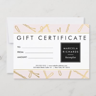 Coordinates with the Chic Gold Bobby Pins Hair Stylist Salon Pink Business Card Template by 1201AM. A fun and eye-catching design of falling faux gold bobby pins create an intriguing background on this customizable gift certificate template for hairstylists hair salons beauty consultants and more. Art and design © 1201AM CREATIVE myEverything