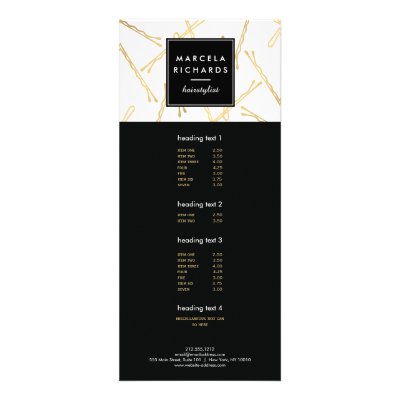 Coordinates with the Chic Gold Bobby Pins Hair Stylist Salon Business Card Template by 1201AM. A fun and retro-inpsired design of falling faux gold bobby pins create an intriguing background on this stylish rack card template for hairstylists hair salons beauty consultants etc. Great to use for a price list service menu promotional flyer and more. © 1201AM CREATIVE myEverything