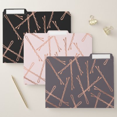 Coordinates with the Chic Rose Gold Bobby Pins Business Cards and Brand Materials by 1201AM. A fun and eye-catching design of falling rose gold bobby pins create an intriguing background on these stylish file folders. This set includes black pink and gray color ways for a unique variety. Original art and design © 1201AM® myEverything