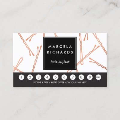 Coordinates with the Chic Rose Gold Bobby Pins Hair Stylist Salon Business Card Template by 1201AM. A fun and eye-catching design of falling faux rose gold bobby pins create an intriguing background on this stylish loyalty punch card for hairstylists hair salons beauty consultants and more. Update the promotion text for your desired offering. Generate more sales and visits by encouraging your customers to return for a discounted service or free product. Use a hole-punch or small stickers to validate each visit. This design is part of a collection of coordinating marketing materials to help brand your beauty business. Art and design © 1201AM CREATIVE myEverything