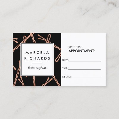 Coordinates with the Chic Rose Gold Bobby Pins Hair Stylist Black Business Card Template by 1201AM. A fun and eye-catching design of faux rose gold bobby pins create an intriguing background on this customizable appointment card template. Great for hair salons hair stylists hairdressers stylists and more. © 1201AM CREATIVE myEverything