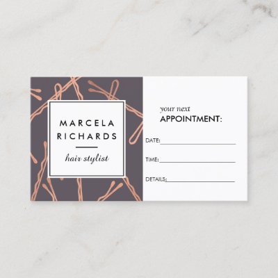 Coordinates with the Chic Rose Gold Bobby Pins Hair Stylist Gray Business Card Template by 1201AM. A fun and eye-catching design of faux rose gold bobby pins create an intriguing background on this customizable appointment card template. Great for hair salons hair stylists hairdressers stylists and more. © 1201AM CREATIVE myEverything
