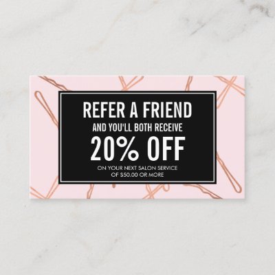 A fun and eye-catching design of falling faux rose gold bobby pins create an intriguing background on this stylish referral card for hairstylists hair salons beauty consultants and more. Update the promotion for your own unique offering. This design is part of a collection of coordinating marketing materials to help brand your beauty business. Find business cards appointment cards gift certificates rack cards and more on the matching collection page.Art and design © 1201AM Design Studio | [--] myEverything