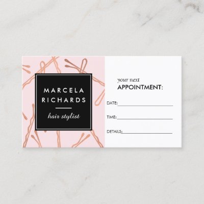 Coordinates with the Chic Rose Gold Bobby Pins Hair Stylist Pink Business Card Template by 1201AM. A fun and eye-catching design of faux rose gold bobby pins create an intriguing background on this customizable appointment card template. Great for hair salons hair stylists hairdressers stylists and more. © 1201AM CREATIVE myEverything