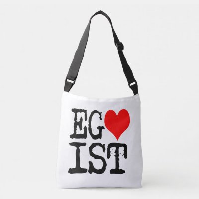 Egoist text. The letter "O" is changed to the image of red heart. Funny designs for egoists and for any other persons who like humor and laugh and do not mind to tease their friends. Cross body bag. Two sides printed. One side - black image the other - denim pattern text. Customizable. You can change both of the images independently. Enjoy and have fun! myEverything