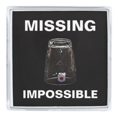 Closeup view of overturned shot glass with dice tie or die inside the glass. Isolated against black background. Impossible to miss! Missing impossible. The real (and the only) way to win a million. Silver Finish Lapel Pin. Customizable. You can change or delete two template texts: MISSING and IMPOSSIBLE. Good luck! myEverything