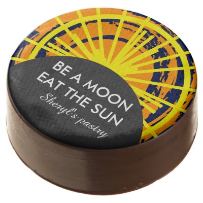 Image of the yellow and orange color shining Sun covered with the dark gray shadow of the Moon. These images symbolize the Great American Total Solar Eclipse. Two white color texts: Be a Moon eat the Sun and Sheryl's pastry over the dark area. Enjoy viewing the total solar eclipse with Sheryl's cakes and cookies. Have fun. Funny one of a kind customizable Milk Chocolate Dipped Oreo® Cookies None Sprinkles. You can change or delete everything. Use the Customize button to fine tune the design. Have fun! myEverything